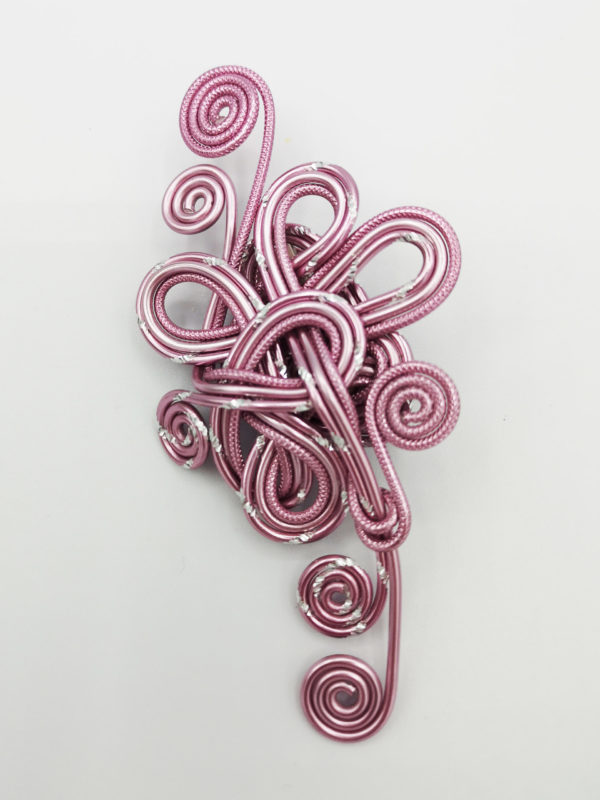 Ročno izdelana broška iz barvne aluminijaste žice premera 2mm v antik roza barvi. Dimenzije cca 12 cm x 5,5 cm, masa 20 g. Igla 2,5 cm – z varnostno zaponko. Možnost kompleta z uhančki. Primerna za spenjanje sakoja. Certifikat Art&Craft Slovenija.