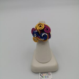 Ročno izdelana ogrlica. Obesek iz barvne aluminijaste žice premera 2 mm v kombinaciji rdeče barve s srebrno, velikost obeska 8 x 3,5 cm, masa 9 g. Izjemno lahek, ne povzroča alergij. Ogrlica z nastavljivim obsegom dolžine 46 cm do 51 cm. Možnost kompleta z drugimi kosi nakita v enaki barvni kombinaciji. Primerna za vsakodnevno nošenje in vse priložnosti. Certifikat Art&Craft Slovenija.
