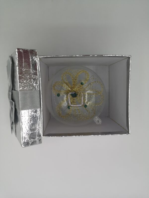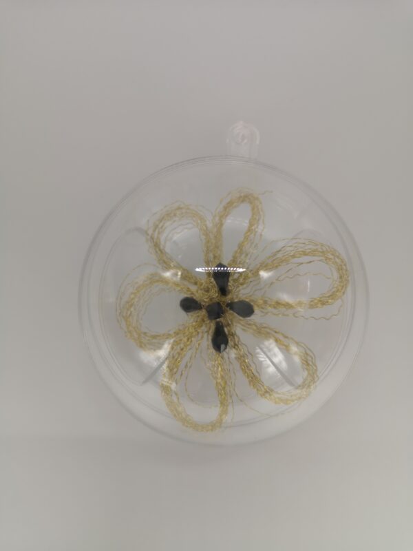Ročno izdelan dekorativni okrasek iz žice v zlati barvi v kombinaciji s črnimi elementi Swarovski. Premer akrilne krogle 8 cm, skupna masa 32 g. Okrasek je primeren za dekoracijo doma ali v poslovnem prostoru. Po želji ga vzamemo iz akrilne krogle in uporabimo za dekoracijo aranžmaja ali novoletne jelke, … Žica ni odporna na vodo – le ta jo lahko poškoduje. Certifikat Art&Craft Slovenija.