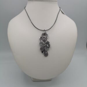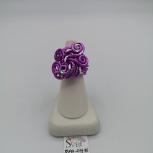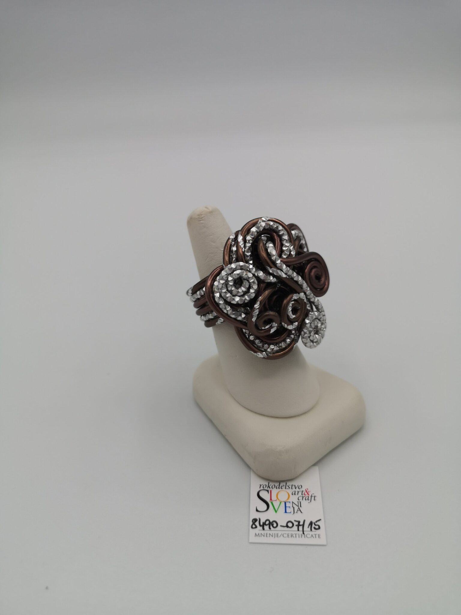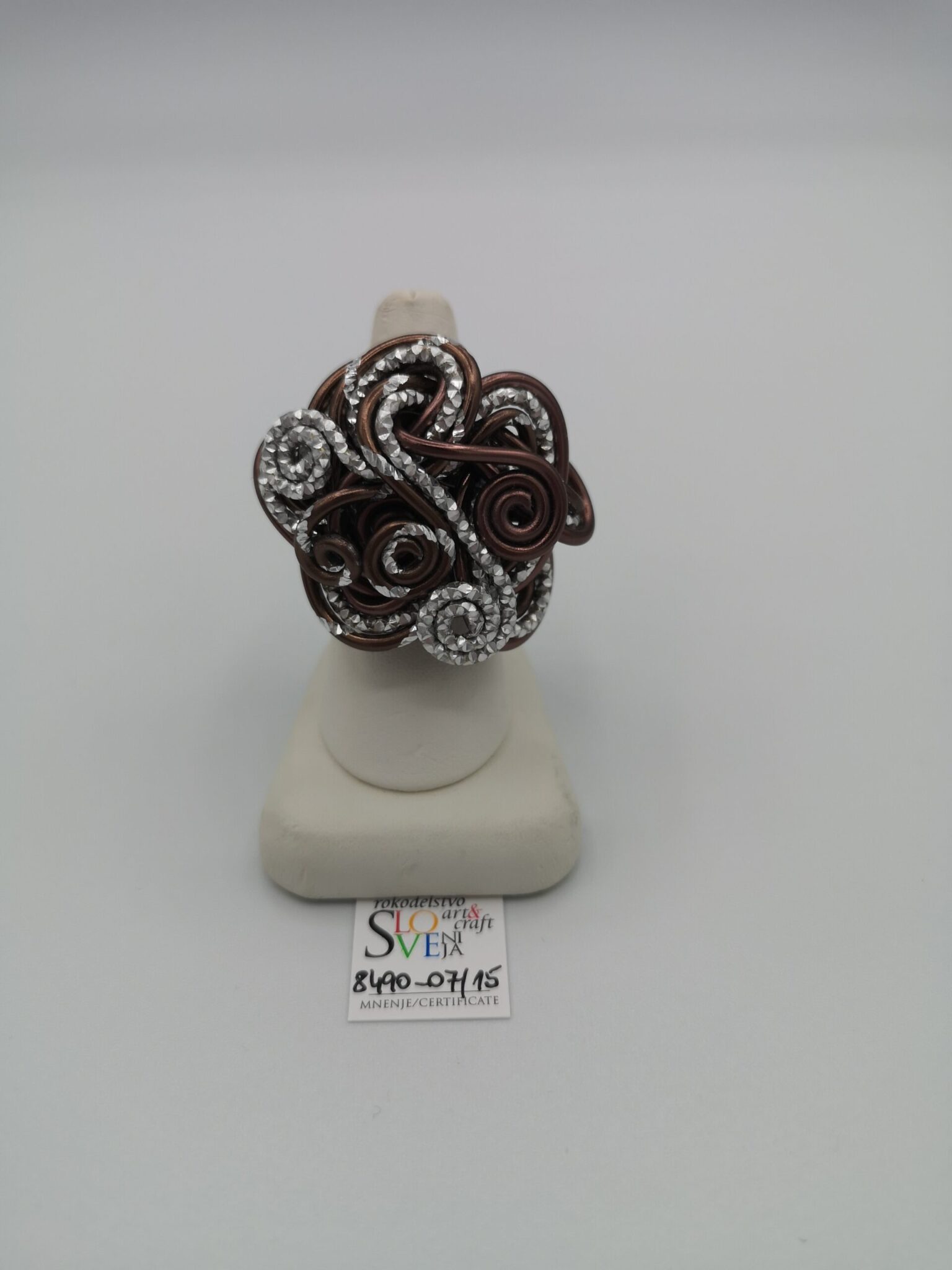 Ročno izdelan prstan z nastavljivim obsegom iz barvne aluminijaste žice premera 2 mm v čokoladno rjavi s kombinacijo srebrne barve. Dimenzije 4 x 4 cm, masa 14 g, nastavljiv obseg od 6,5 cm do 7 cm. Izjemno lahek material, ne povzroča alergij, zelo obstojne barve tudi v vodi. Primeren za vsakodnevno nošenje in za vse priložnosti. Možnost kompleta z zapestnico ali drugimi kosi nakita v isti barvni kombinaciji. Certifikat Art&Craft Slovenija.