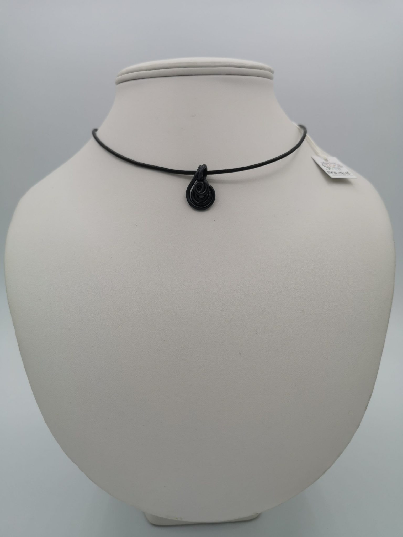 Ročno izdelana ogrlica iz barvne aluminijaste žice premera 2 mm v črni barvi, velikost obeska 2 x 1,5 cm, masa 4 g. Izjemno lahek material, ne povzroča alergij. Usnjena vrvica premera 2 mm v črni barvi dolžine 46 cm do 51 cm. Primerna za vsakodnevno nošenje in vse priložnosti. Možnost izdelave po naročilu. Certifikat Art&Craft Slovenija.