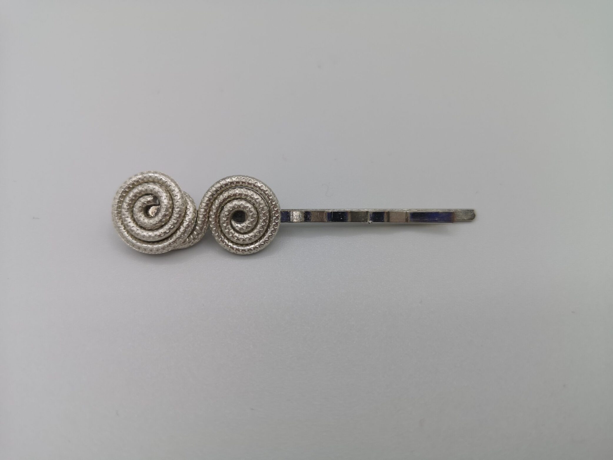 Ročno izdelana sponka za lase iz barvne aluminijaste žice premera 2mm v biserni barvi. Dimenzije sponke 5,5 cm, okrasni del 2,5 X 1 cm, masa 2 g. Možnost kompleta z drugimi kosi nakita v biserni barvi. Primerna za vsakodnevno nošenje. Certifikat Art&Craft Slovenija.