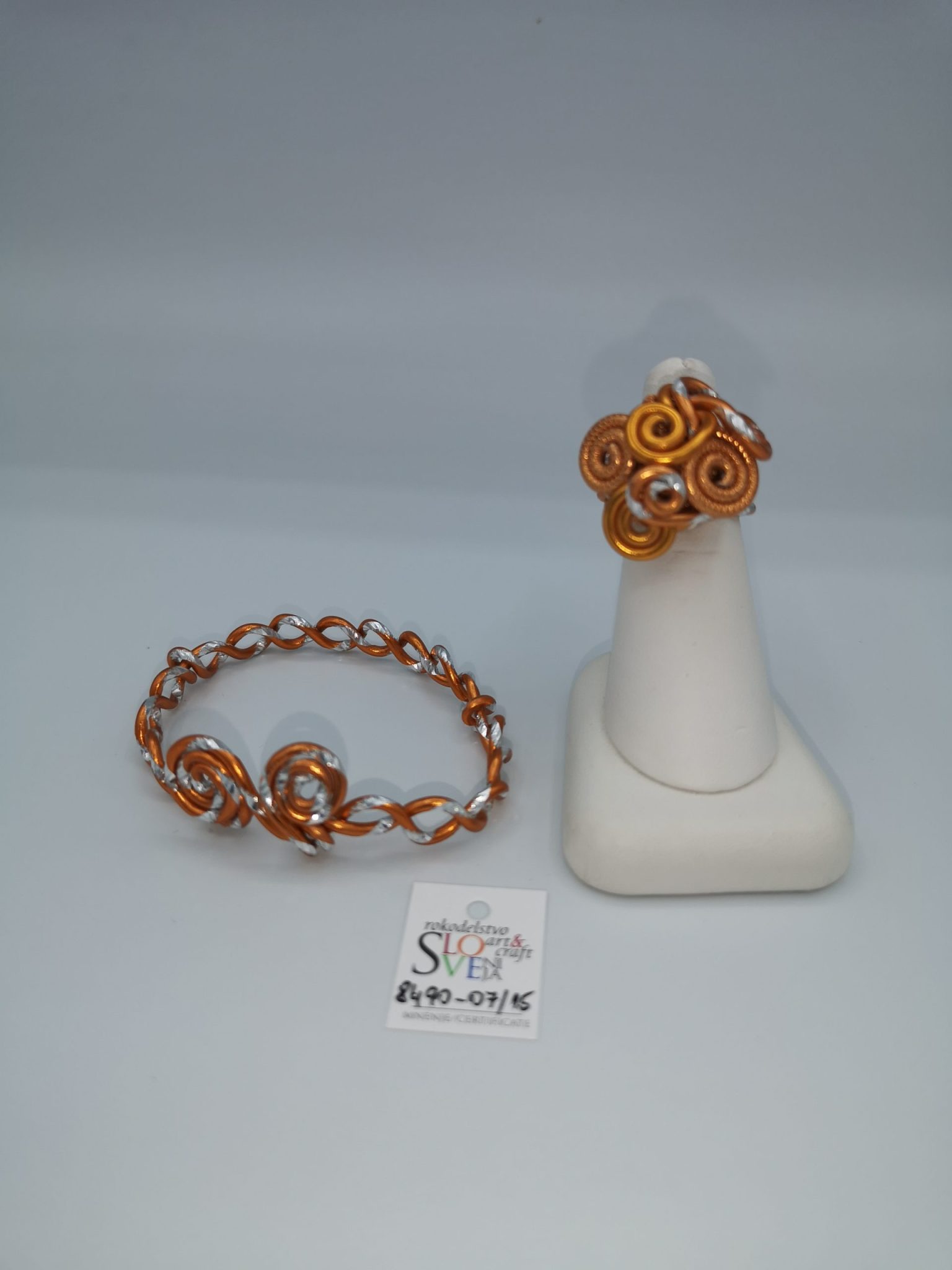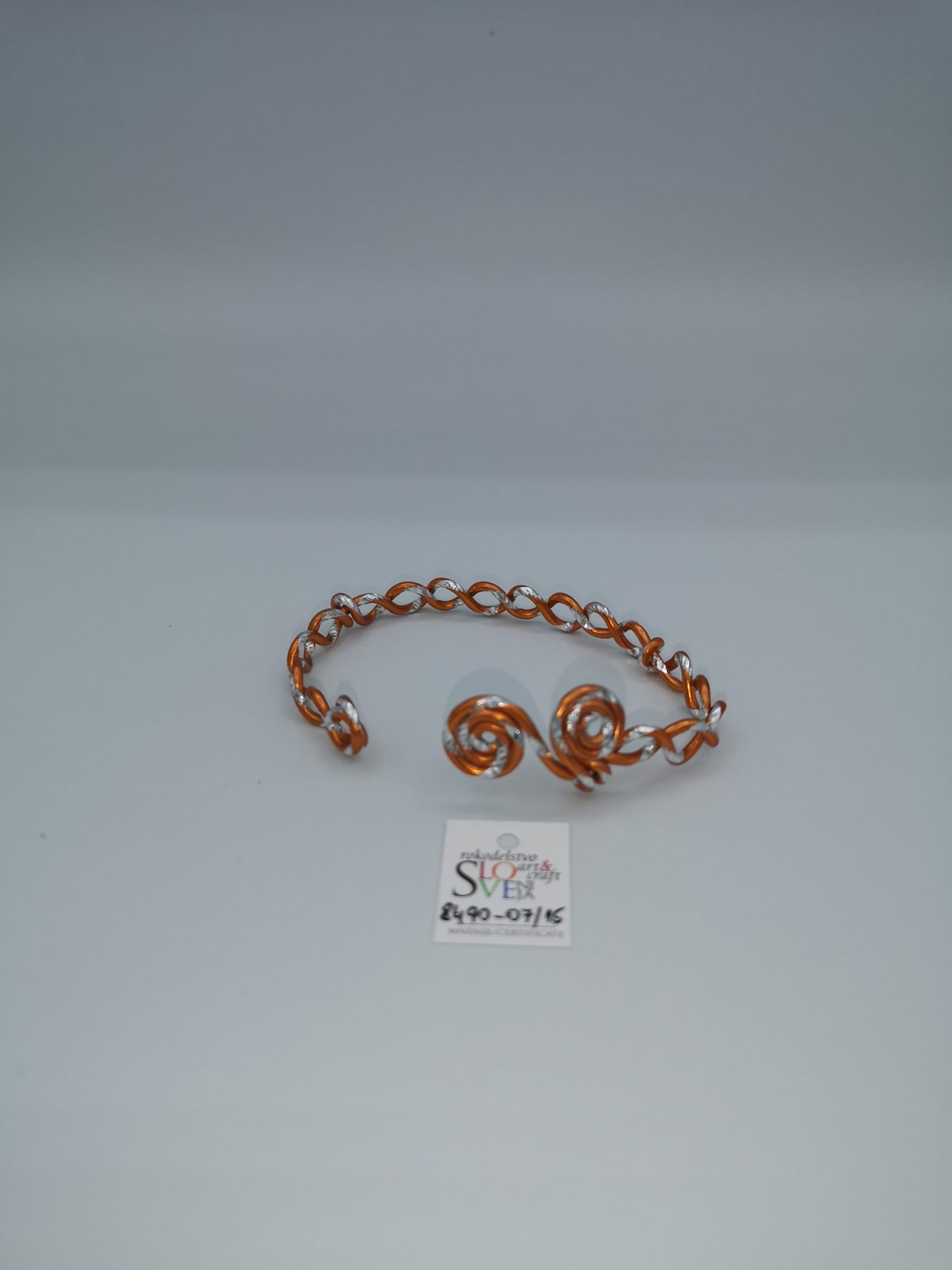 Ročno izdelana zapestnica iz barvne aluminijaste žice premera 2 mm v kombinaciji oranžne in srebrne barve, dolžina 17 cm, masa 4 g. Izjemno lahek material, ne povzroča alergij, zelo obstojne barve tudi v vodi. Primerna za vsakodnevno nošenje in vse priložnosti. Možnost kompleta z drugimi kosi nakita v enaki barvi ali več enakih zapestnic v različnih barvah. Zapestnico s prijemom na obeh koncih razklenemo, da jo lahko nadenemo na zapestje in sklenemo. Certifikat Art&Craft Slovenija.